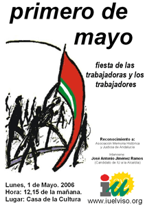 Manifiesto de Izquierda Unida de El Viso del Alcor sobre la celebración del primero de mayo, dicho manifiesto será leído en el Acto Público que organizamos el próximo Lunes a las 12:15 en la Casa de la Cultura de nuestra localidad. En él se darán también los tradicionales reconocimientos.