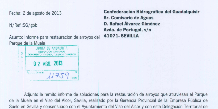Continúa Manuel García diciendo que Granada Santos no ha mostrado interés en el Parque de la Muela, cosa totalmente falsa porque es gracias a ella y precisamente a su interés por rescatar el Parque de la Muela, cuando se inician los trámites para hacer coincidir las obras en el arroyo de la Muela, competencia de la Confederación Hidrográfica del Guadalquivir, y la rehabilitación del Parque de la Muela, competencia del Ayuntamiento del El Viso del Alcor. Por eso Confederación no puede pedirle al Ayuntamiento dinero alguno, ya que es de su competencia exclusiva, igualmente, el Ayuntamiento tendría que poner dinero en el Parque de la Muela porque es de su competencia. Dice que él mismo instó al Comisario de aguas de la Confederación para el arreglo del arroyo, obviando que la Delegada Granada Santos también estaba en esa petición como se ve en la imagen de más abajo.