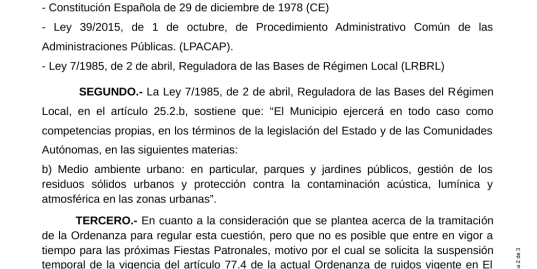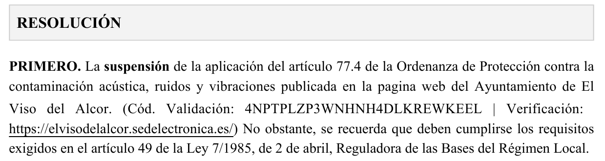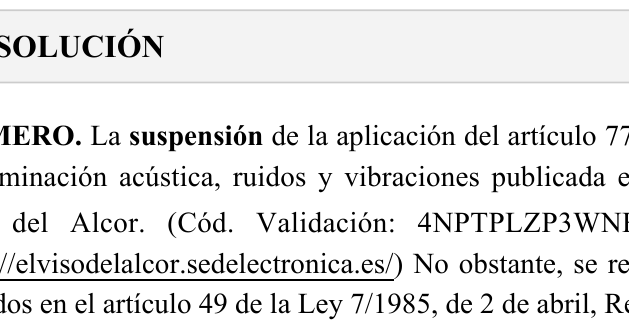 Creemos que el Alcalde, Gabi Santos, ha cometido una grave irregularidad arrogándose competencias que no son suyas, ya que ha suspendido parte de la Ordenanza Municipal de Ruidos, aprobada por el Pleno. Las ordenanzas las aprueba el Pleno, y es el único órgano que puede modificarlas. Solo podría hacerlo directamente el Alcalde en caso de emergencia, cosa que no ocurre en este caso. Por eso hemos denunciado este hecho ante la Subdelegación de Gobierno, creemos que el decreto firmado es nulo de pleno derecho.