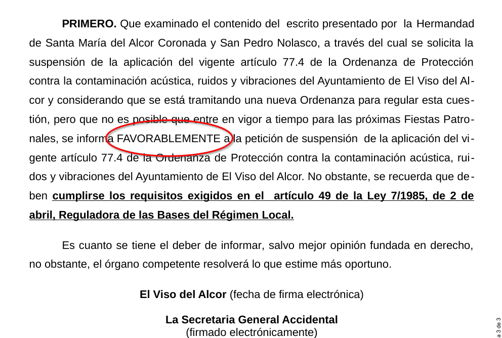 Ante esta situación, y tras una nueva solicitud de la Hermandad del 29 de agosto, mismo día del Pleno, donde pide la suspensión de la ordenanza en vigor, el Alcalde decide suspenderla, mediante decreto. Concretamente, suspende el apartado del artículo que limita el uso de material pirotécnico. Por cierto, en el decreto suspende el artículo 77.4, apartado que no existe, porque el artículo en vigor es realmente es el 79.4. Gabi Santos ha firmado un decreto citando una versión no publicada de la ordenanza. Por si fuera poco, el informe emitido por la Secretaria General accidental no menciona ningún artículo en el que apoyar su dictamen favorable al decreto.