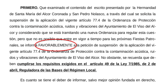 En el mes de febrero, la Hermandad de Santa María del Alcor Coronada solicitó la modificación de la Ordenanza de Ruidos. Nuestro grupo mantuvo una reunión con la Hermandad para conocer las propuestas que hacían y para hacerles llegar nuestras alegaciones para minimizar lo máximo posible el impacto del ruido de los cohetes durante las Fiestas Patronales. La Hermandad se comprometió a que los cohetes fueran de menor potencia y a seguir un calendario de lanzamientos. Más allá de esta reunión, tal como estaba la ordenanza imposibilitaba lanzar cohetes como se venía haciendo en años anteriores. El año pasado tanto la Hermandad como algún vecino fue denunciado por el Seprona.