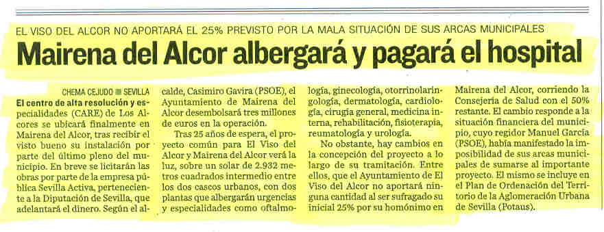 Ayer jueves 9 de julio, aparecía una noticia en un diario provincial haciéndose eco de la decisión final acerca de la ubicación del Centro de Alta Resolución y Especialidades, el cual se instalará en el término de la vecina localidad de Mairena del Alcor.
